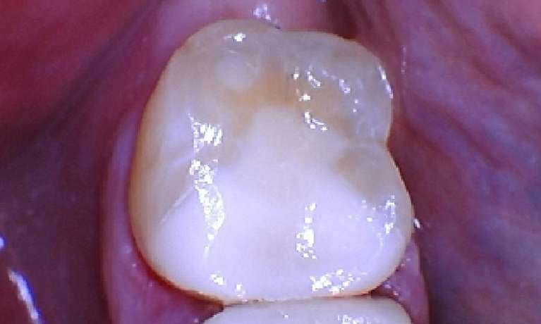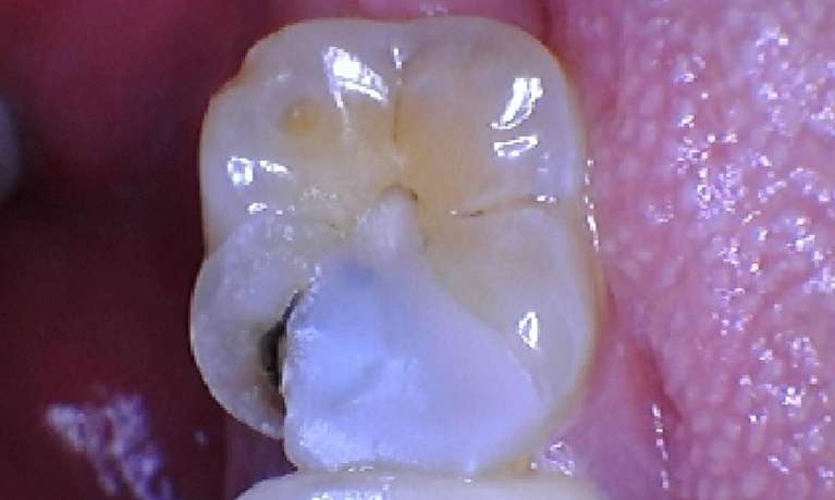 Patient lost a silver filling. After the decay was removed we placed a white resin composite dental filling.