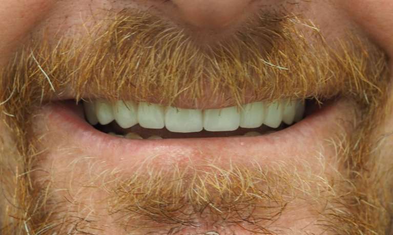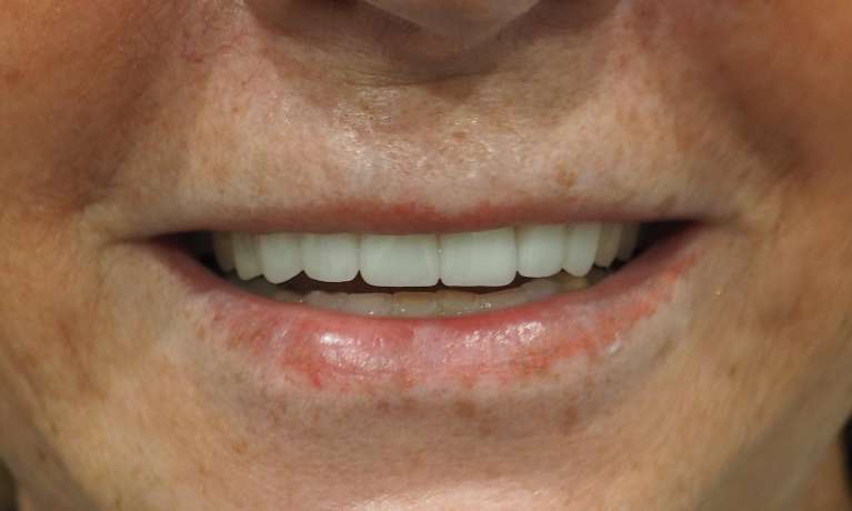 Patient had six damaged and crooked teeth extracted. Natural-looking denture placement was held the same day to fill in missing and extracted teeth. Dentures were made to perfectly match patient's existing white tooth color.
