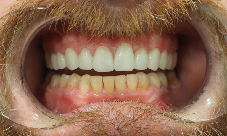 Patient presented with infection on his front teeth and missing back teeth. Six extractions were performed, followed by immediate same-day denture placement.