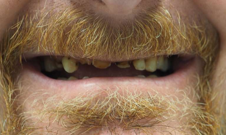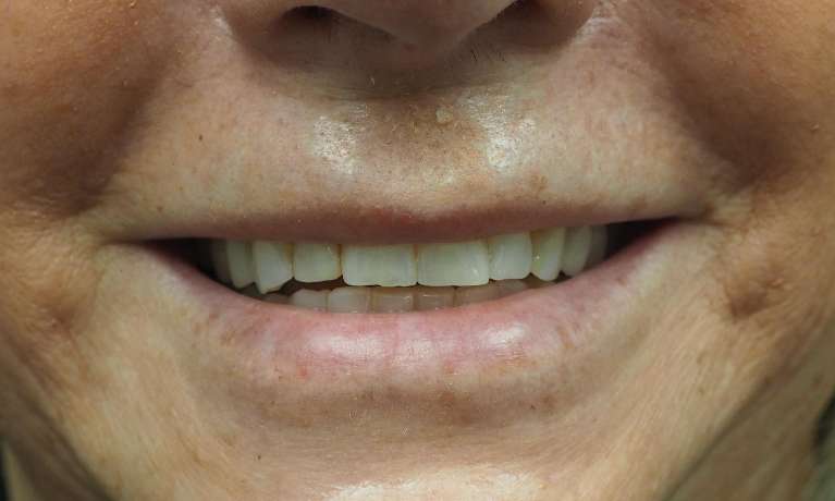 Patient had cavities on front teeth that were repaired with tooth-colored resin dental fillings.