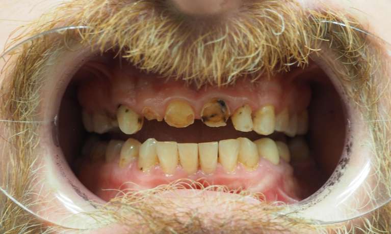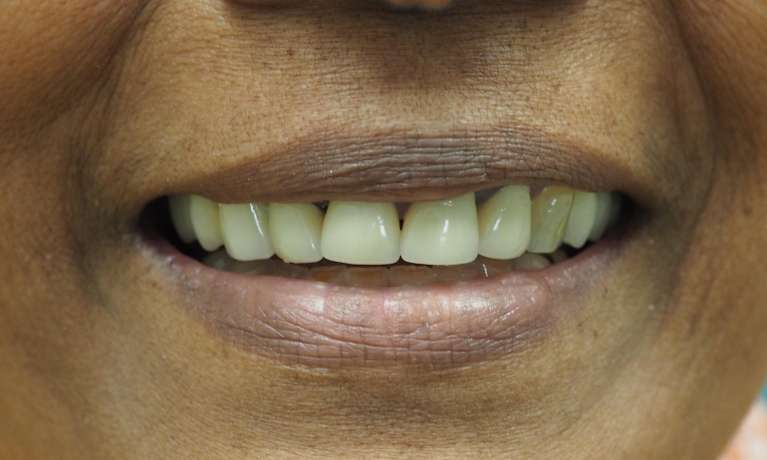 Smile makeover with porcelain crowns completed. Patient had extensive decay and broken teeth due to years of neglect. All affected teeth restored with full-coverage porcelain crowns to improve aesthetics, function, and overall smile.
